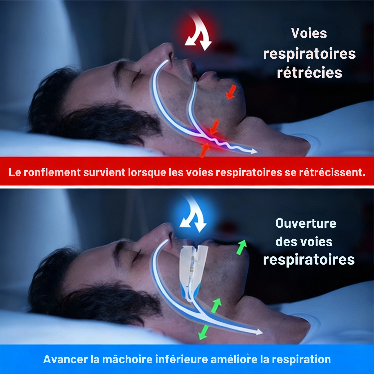 Après mise en place de l’orthèse, la mâchoire inférieure avance légèrement et libère instantanément l’espace dans les voies respiratoires. L’air circule beaucoup plus facilement, sans obstruction. Les vibrations disparaissent, la respiration redevient fluide et silencieuse, et le sommeil gagne en qualité.