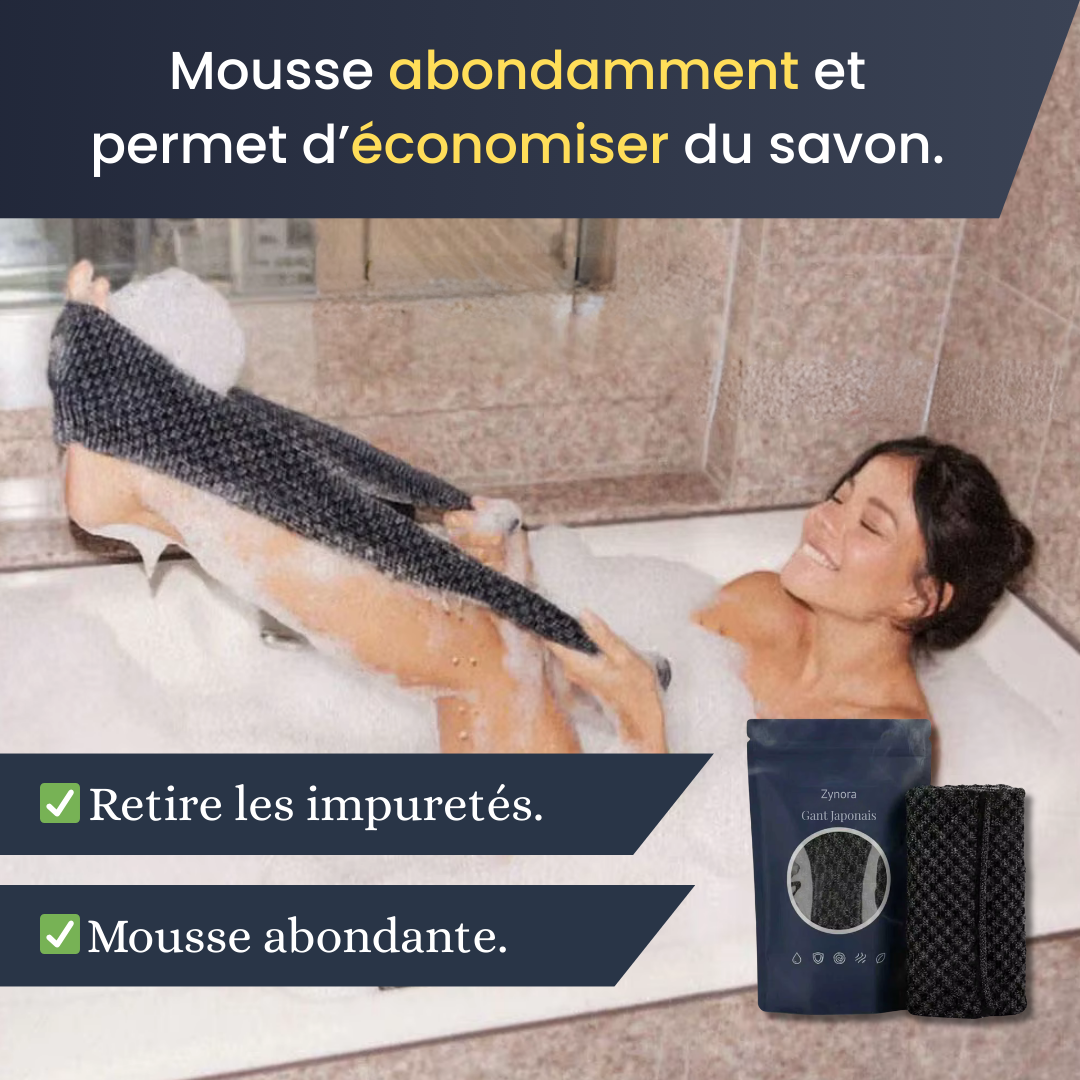 Le Zynora™ Gant Japonais est spécialement conçu pour nettoyer les zones difficiles d’accès, tout en offrant une exfoliation efficace et un grand pouvoir moussant.
